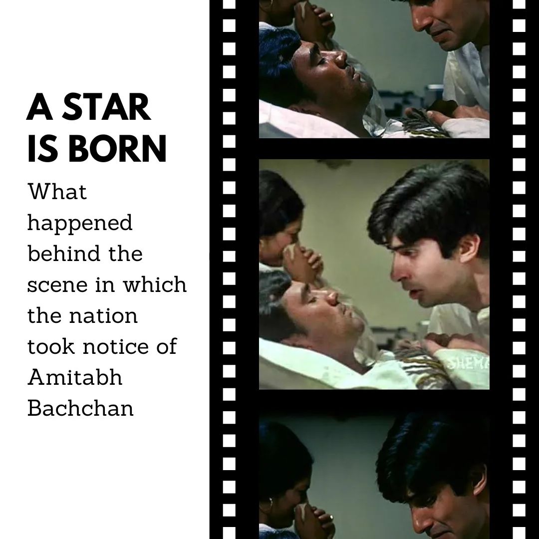 It might seem a bit odd that for Amitabh Bachchan’s birthday, I am sharing a still from a movie that perhaps marked the pinnacle of Rajesh Khanna’s career. But when one superstar struck his highest note, yet another one began making inroads with this very film. Amitabh Bachchan recounted in his interviews how he felt he’d arrived since he was getting a chance to act alongside Rajesh Khanna, who had redefined the concept of superstardom in Bombay. Anand had a light mood throughout, which got punctuated with a sense of impending doom every now and then. The feeling had to explode in full force in the climax. Anand (Rajesh Khanna) has passed away and his friend and doctor Bhaskar (Amitabh) enters the room realising he has missed the last moments of his friend. What we see is a complete breakdown of Bhaskar. And then, without warning, one hears the tape recording of Anand, which plays out his famous “Babumoshai! Hum sab rangmanch ki kathputhliyan hai…“